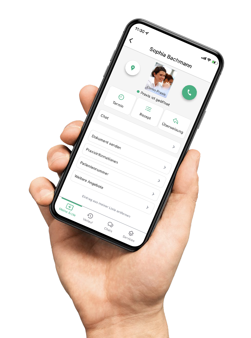 Sobald die Praxis einmal in der App hinzugefügt ist, stehen alle wichtigen Informationen und Anfragemöglichkeiten jederzeit schnell zur Verfügung.*