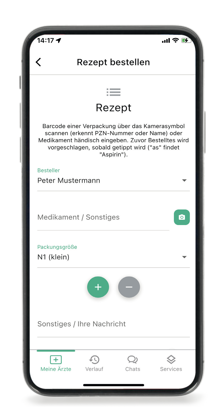 Ein integrierter PZN-Scanner im Bereich der Rezeptanfrage, erleichtert die Erfassung eines Medikamentes, indem Sie den Barcode auf der Verpackung scannen. Zudem merkt sich die App bestellte Medikamente und Sie können diese aus einer Liste auswählen.